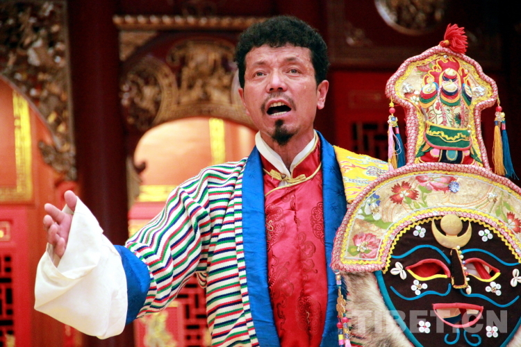 拉薩市城關區(qū)娘熱民間藝術團成員、西藏自治區(qū)級覺木隆藏戲傳承人洛桑次仁是目前為數不多的掌握了全部“八大藏戲”唱腔、表演的戲師。圖為洛桑次仁表演藏戲唱腔《朗薩雯波》之貢桑德慶唱腔攝影:劉莉