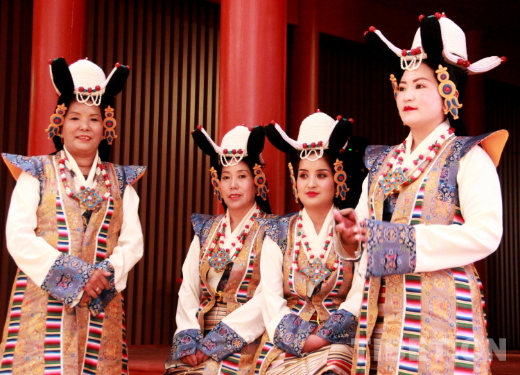 圖為拉薩市城關區(qū)娘熱民間藝術團演員央宗(左一)、德吉卓嘎(左二,拉薩市級覺木隆藏戲傳承人)、洛桑卓瑪(左三)和強珍正在候場 攝影:劉莉