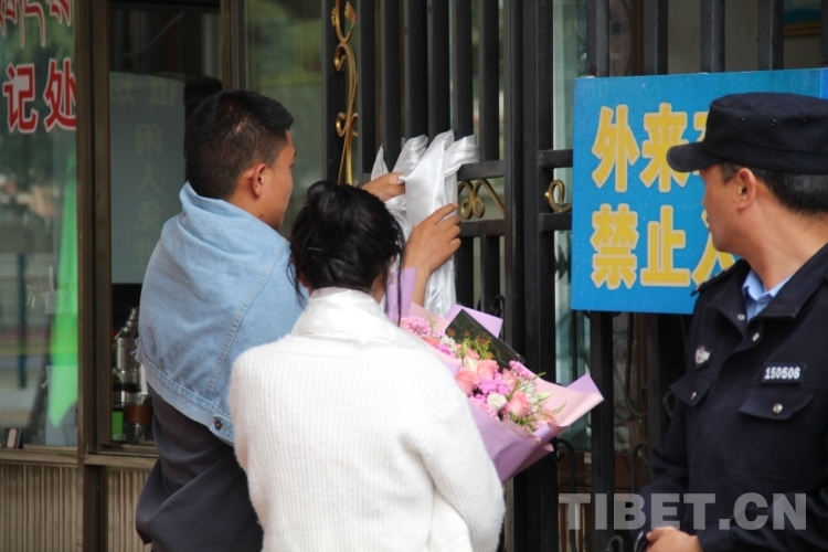 圖為考生考試結(jié)束后向母校的大門(mén)掛哈達(dá)表感激 攝影:德吉卓瑪