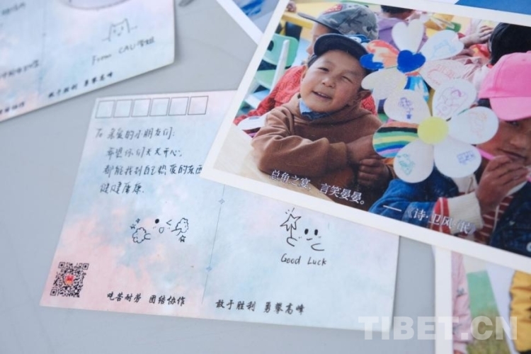 參與活動的同學們在峰云社人文科考隊準備的明信片上寫下對當?shù)匦∨笥衙篮玫淖8?。一張張寫著滿滿關切話語、畫著生動可愛圖案的明信片上,飽含著中國農(nóng)業(yè)大學師生對雪域高原孩子們滿滿的愛意。