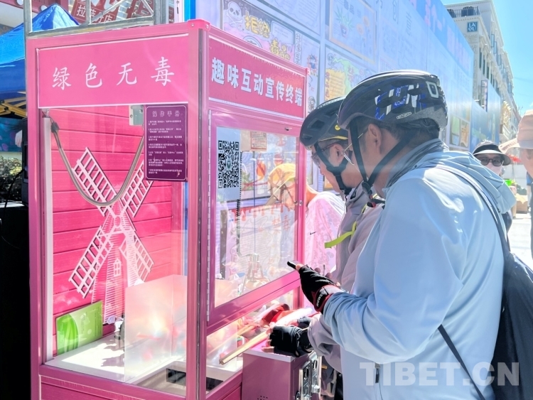 圖為路過(guò)群眾在趣味互動(dòng)宣傳終端掃碼答題抓“牦牦” 攝影:德吉卓瑪