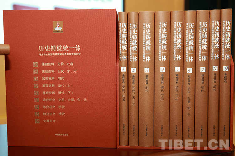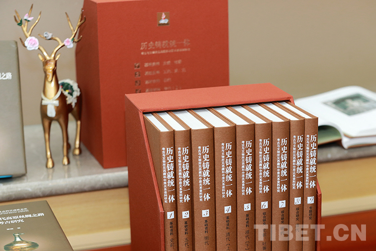 圖為發(fā)布會現(xiàn)場展覽的《歷史鑄就統(tǒng)一體:考古與文物所見西藏和中原關系資料研究》全套圖書 攝影:陳衛(wèi)國