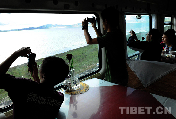 “天路”列車在通過錯那湖時,旅客們紛紛用手機(jī)拍攝美景(唐召明2012年8月12日攝)