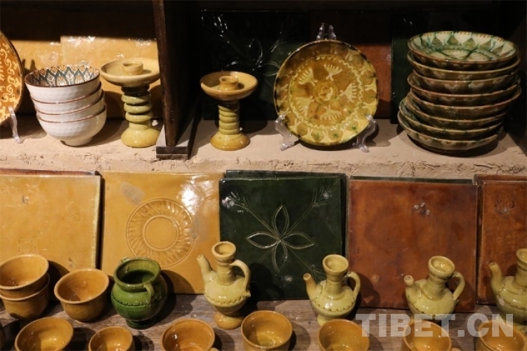 這里的土陶都緊湊而有序地被擺放在架子上,或者集中放在房間的空地上圍成一圈。一眼看去,架子上的土陶手工藝品都透露出泥土本身的顏色質(zhì)感,部分碗碟、杯具等制品通過各類顏色的浸染,呈現(xiàn)出青翠欲滴或金黃澤亮的顏色樣態(tài),在無聲中展現(xiàn)著古樸技藝的獨特魅力。