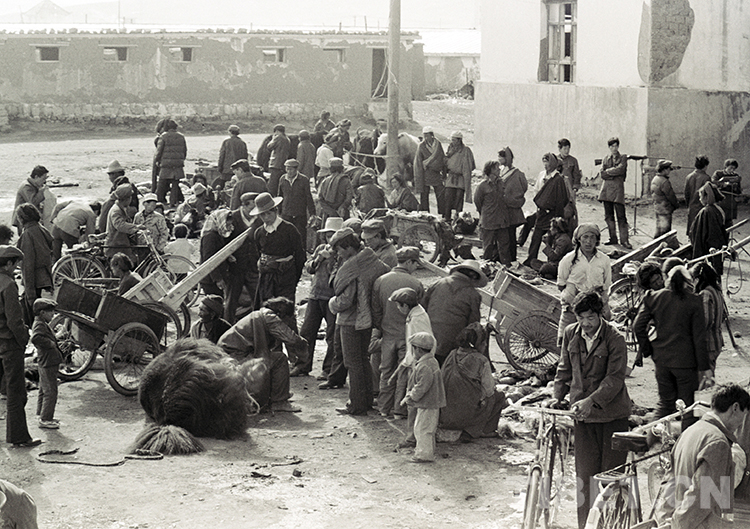 昔日那曲鎮(zhèn)露天市場,牧民群眾正在售賣現場宰殺的新鮮牦牛肉(唐召明1987年攝)