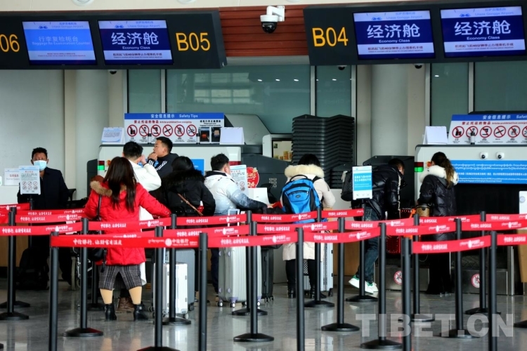 圖為1月26日春運首日,拉薩貢嘎機場內旅客有序排隊辦理登機手續(xù) 攝影:王佳豪
