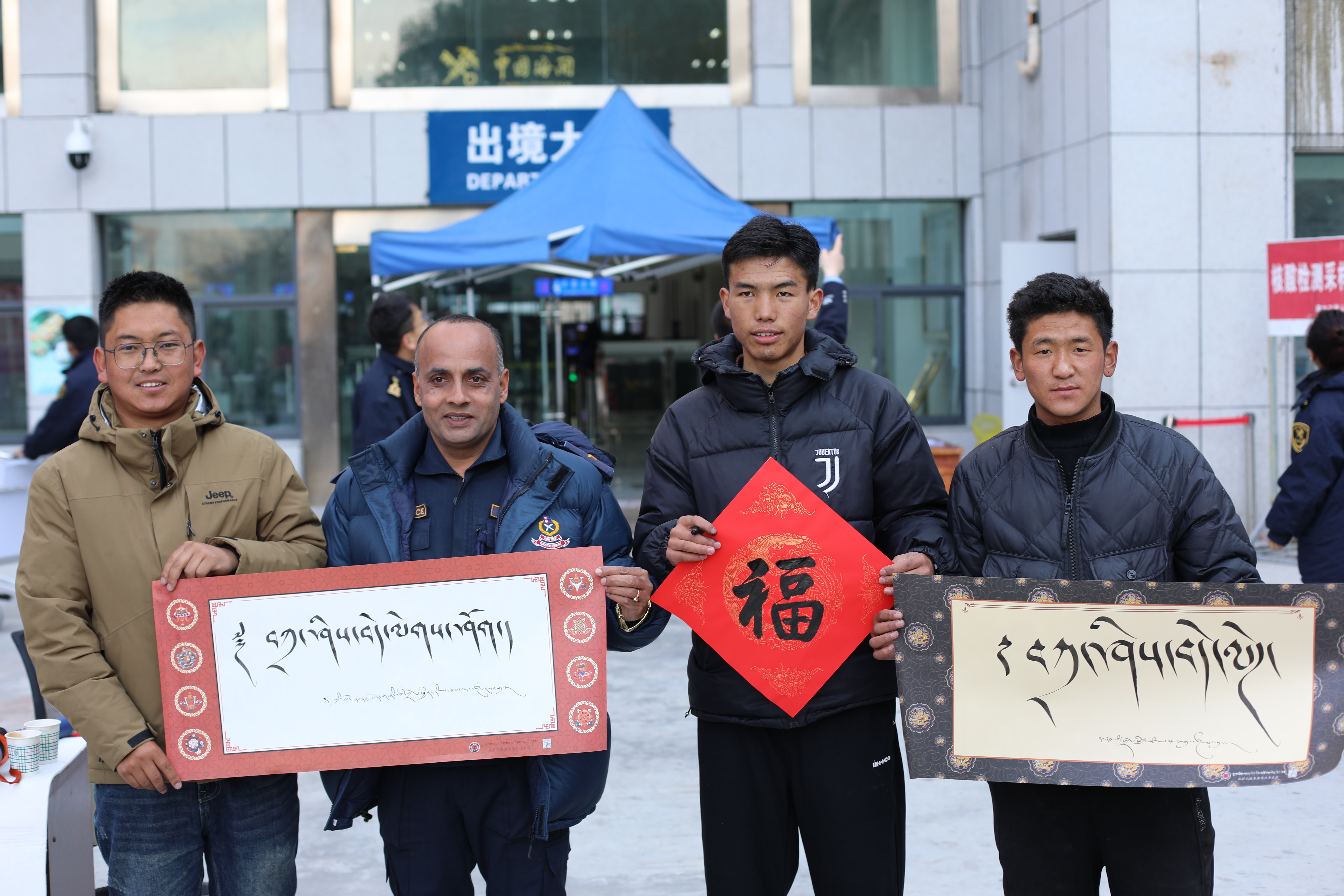 圖為文藝志愿者為尼泊爾海關(guān)送祝福。