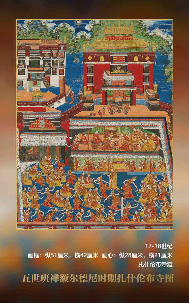 畫(huà)面以四世班禪靈塔殿為中心而不及其他,推測(cè)其年代應(yīng)為五世班禪時(shí)期。
