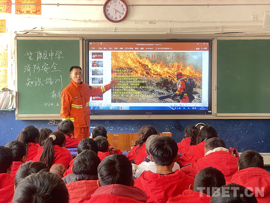 在芒康縣中學(xué)授課現(xiàn)場(chǎng),芒康縣森林消防分隊(duì)負(fù)責(zé)人夏能向全校師生講解森林防火的重要意義、火災(zāi)的起因、相關(guān)法律法規(guī)和常用防火知識(shí)等,教育引導(dǎo)同學(xué)們樹(shù)立森林防火意識(shí),做到不帶火種進(jìn)山,發(fā)現(xiàn)火情及時(shí)報(bào)警。