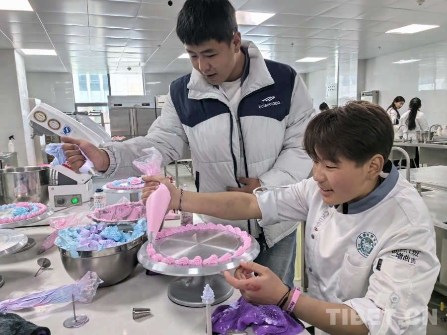 圖為西藏技師學(xué)院的學(xué)生正在面點課上練習(xí)裱花 攝影:王淑
