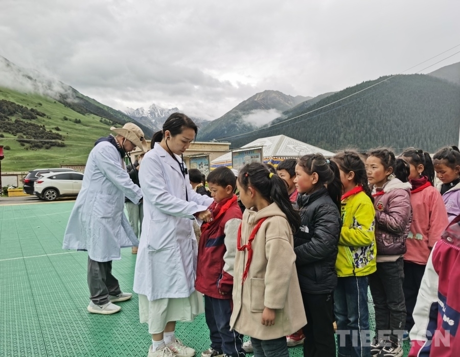 圖為醫(yī)療專家團(tuán)隊在巴塘縣波密鄉(xiāng)格木村中心小學(xué)開展先心病篩查聽診工作 攝影:白瑪司郎