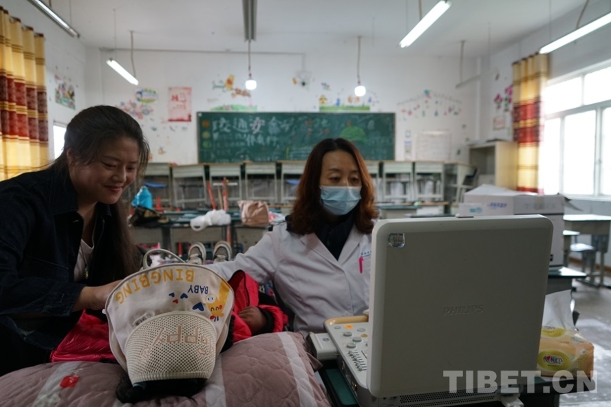 圖為7月9日,首都醫(yī)科大學(xué)附屬北京安貞醫(yī)院小兒心臟中心主任醫(yī)師李文秀在阿察小學(xué)義診點(diǎn)為兒童做超聲檢查 攝影:周晴晴