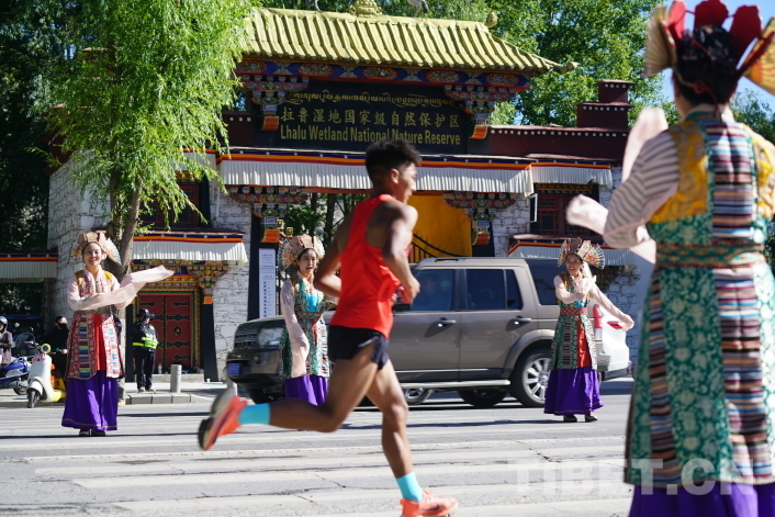 圖為 2024拉薩半程馬拉松18公里處參賽選手途經(jīng)拉魯濕地國家級自然保護區(qū),拉薩市城關(guān)區(qū)藏戲藝術(shù)團以藏戲的形式為選手加油助威 攝影:趙振宇