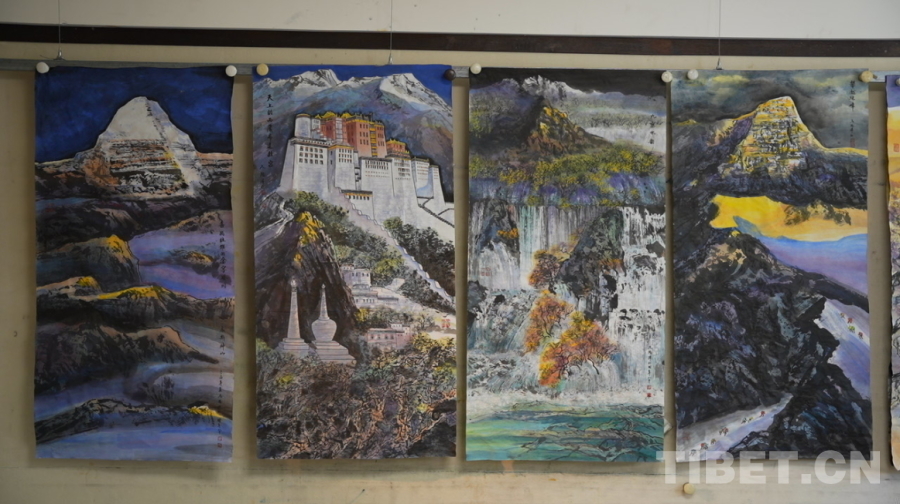 圖為尼瑪澤仁即將帶往法國的四幅展覽畫作,從左到右分別是《喜馬拉雅的金字塔岡底斯神山》《天上的西藏布達拉宮》《九寨水韻》《攀越珠峰》 攝影:陳浩力