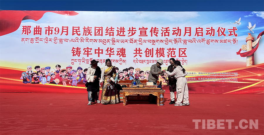 啟動(dòng)儀式結(jié)束后,色尼區(qū)文藝團(tuán)為現(xiàn)場(chǎng)觀眾獻(xiàn)上了那曲市民族團(tuán)結(jié)進(jìn)步主題歌曲《我們的和美羌塘》《羌塘普古》《國(guó)旗下的牧民》等一系列精彩的文藝表演。其中,《羌塘普古》以其別具特色的藏族舞蹈,展現(xiàn)了那曲高原的壯麗與人民的豪邁;小品《中華民族一家親》通過(guò)生動(dòng)的故事情節(jié)和真摯的情感表達(dá),深刻詮釋了中華民族多元一體的文化內(nèi)涵和各民族之間血濃于水的深厚情誼?,F(xiàn)場(chǎng)笑聲不斷、氣氛活躍、熱鬧非凡,充分展示了那曲市民族團(tuán)結(jié)進(jìn)步的良好氛圍。(中國(guó)西藏網(wǎng) 記者/楊加才讓 旦曲)