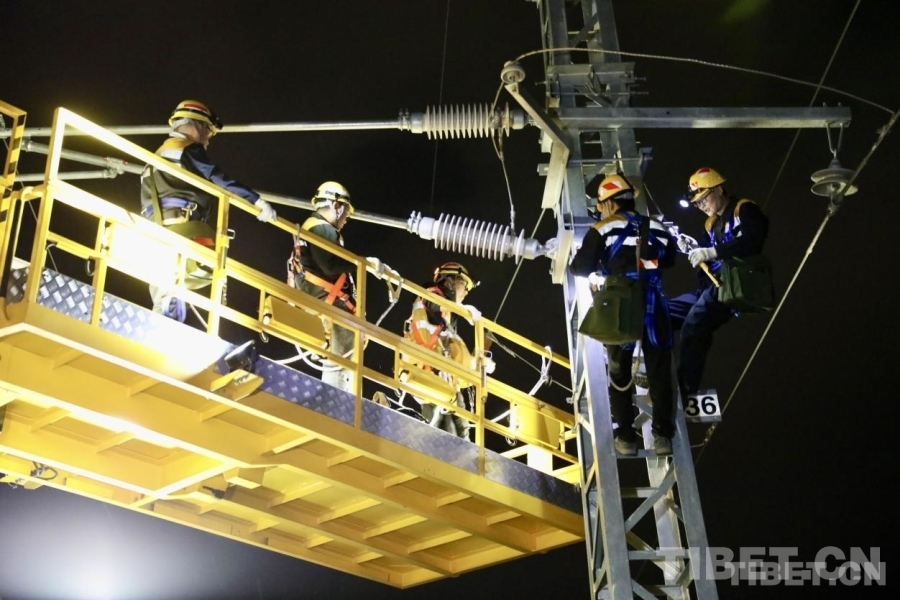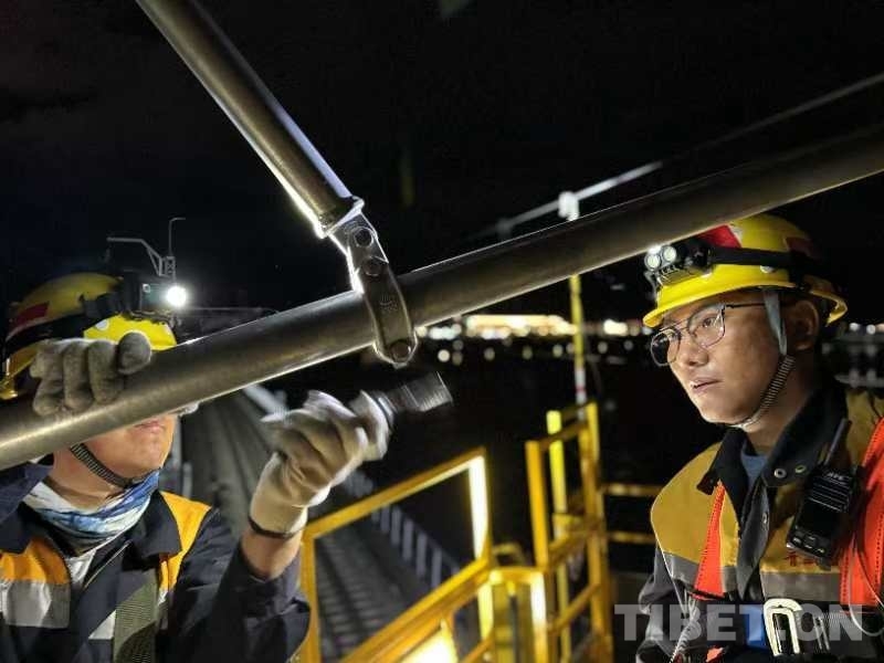23時00分,軌道車穩(wěn)穩(wěn)停靠,“天窗”作業(yè)命令下達。中國鐵路青藏集團有限公司拉薩基礎(chǔ)設(shè)施段供電維修技術(shù)中心拉薩南接觸網(wǎng)維修隊工長李積王帶著7名工友走下接觸網(wǎng)作業(yè)車,驗電、連接地線端、接掛地線……一系列操作一氣呵成。隨即,現(xiàn)場負責(zé)人拉加和工友們依次登上距離地面6米高的作業(yè)平臺上,穿梭于接觸網(wǎng)線索之間,猶如凌空“舞者”。