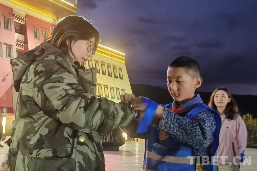 夜幕降臨,研學(xué)游團(tuán)隊(duì)來到文成公主劇場。穿上藍(lán)馬甲,孩子們搖身一變成了文明旅游的小小宣傳員。帕里鎮(zhèn)小學(xué)注重培養(yǎng)學(xué)生的生態(tài)文明意識,自2023年7月起,主動加入“美麗公約”志愿組織的“擦亮天路行動”。學(xué)生定期在帕里鎮(zhèn)清理垃圾,也會為沿國道562來到帕里的游客宣傳垃圾隨身走的文明旅游理念。今天,來到拉薩,孩子們再次熟練地向劇場周圍的觀眾宣傳起來,一邊為大家在右臂系上代表文明旅游承諾的藍(lán)絲帶,一邊鼓勵“一起守護(hù)第三極,因?yàn)橛心悖袊馈薄?/span>一時(shí)間,文成公主劇場周圍成為了藍(lán)絲帶的海洋。