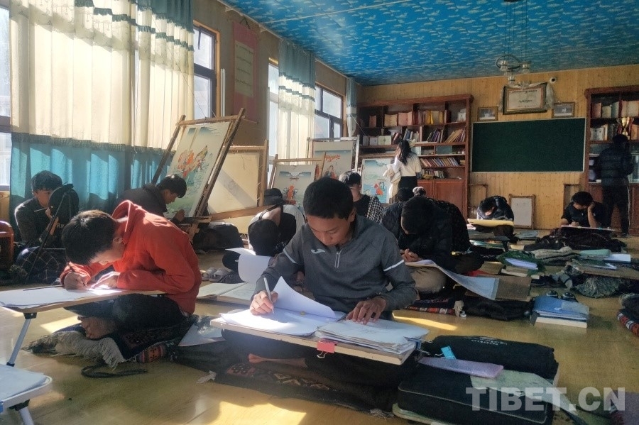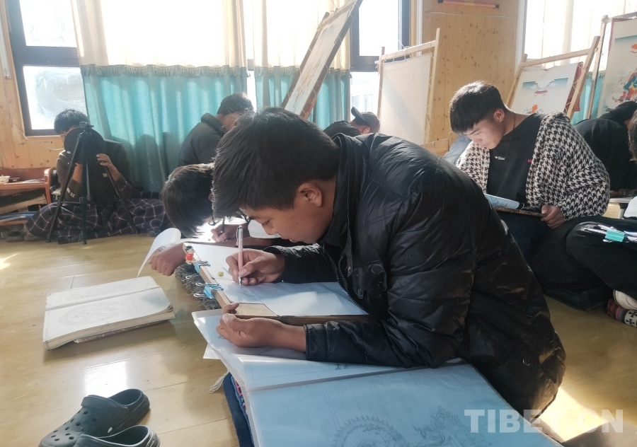 圖為更嘎東周在練習(xí)唐卡白描 攝影:周晴晴