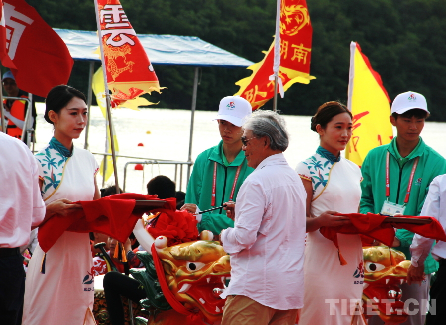 賽前,在龍舟巡游活動(dòng)后,國(guó)家民委副主任郭衛(wèi)平,海南省委常委、宣傳部部長(zhǎng)王斌,香港代表團(tuán)顧問(wèn)、中國(guó)香港體育協(xié)會(huì)暨奧林匹克委員會(huì)會(huì)長(zhǎng)霍震霆,香港代表團(tuán)團(tuán)長(zhǎng),香港文化體育及旅游局體育專員蔡健斌,國(guó)家民委文化宣傳司司長(zhǎng)張謀,國(guó)家民委港澳臺(tái)辦公室主任魏國(guó)雄,海南省政府副秘書長(zhǎng)國(guó)章成,國(guó)家民委文化宣傳司副司長(zhǎng)張劍輝,國(guó)家民委港澳臺(tái)辦公室副主任趙靜,海南省民委副主任黎梁東,海南省旅文廳副廳長(zhǎng)王忠云,海南省三亞市政府副市長(zhǎng)張長(zhǎng)豐為龍舟點(diǎn)睛、披紅,將比賽氛圍烘托得格外喜慶熱烈。