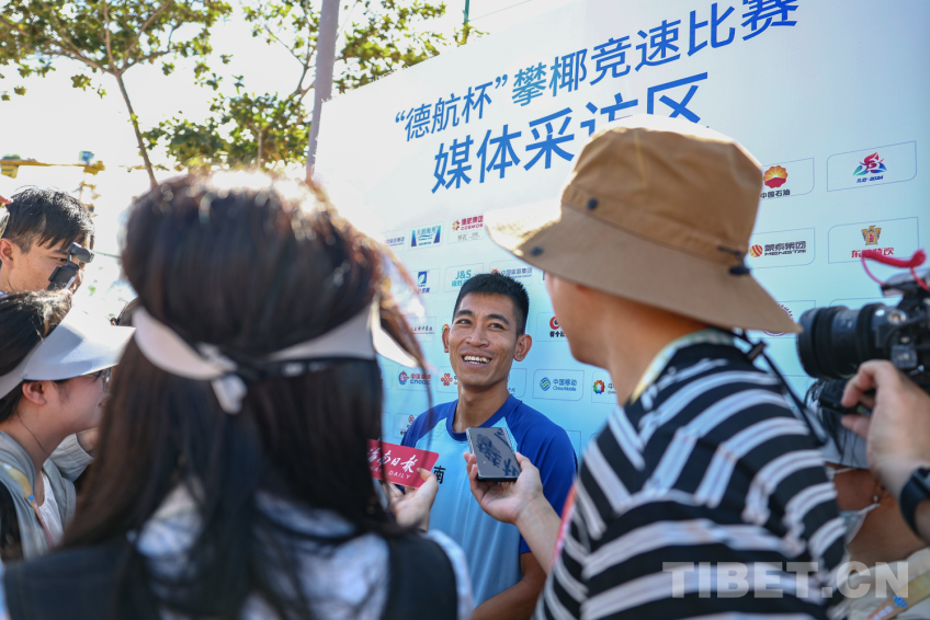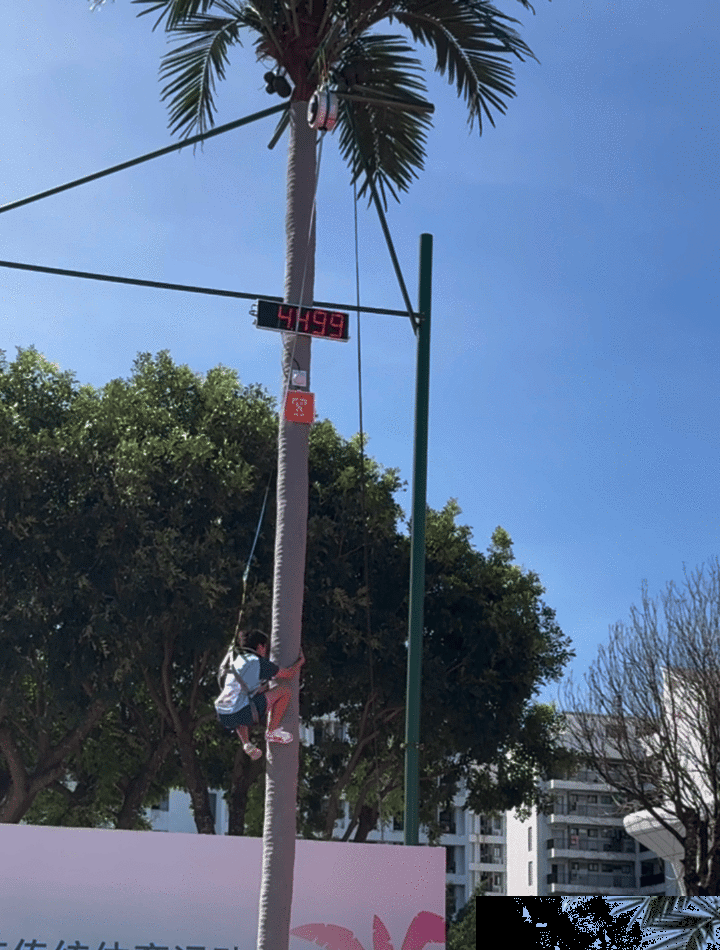 攀椰競速設(shè)立男子攀椰9米競速和女子攀椰7米競速兩個項目,比賽要求運動員使用統(tǒng)一提供的攀椰運動用具,徒手攀爬至椰樹頂部并按下計時器,用時短者獲勝。