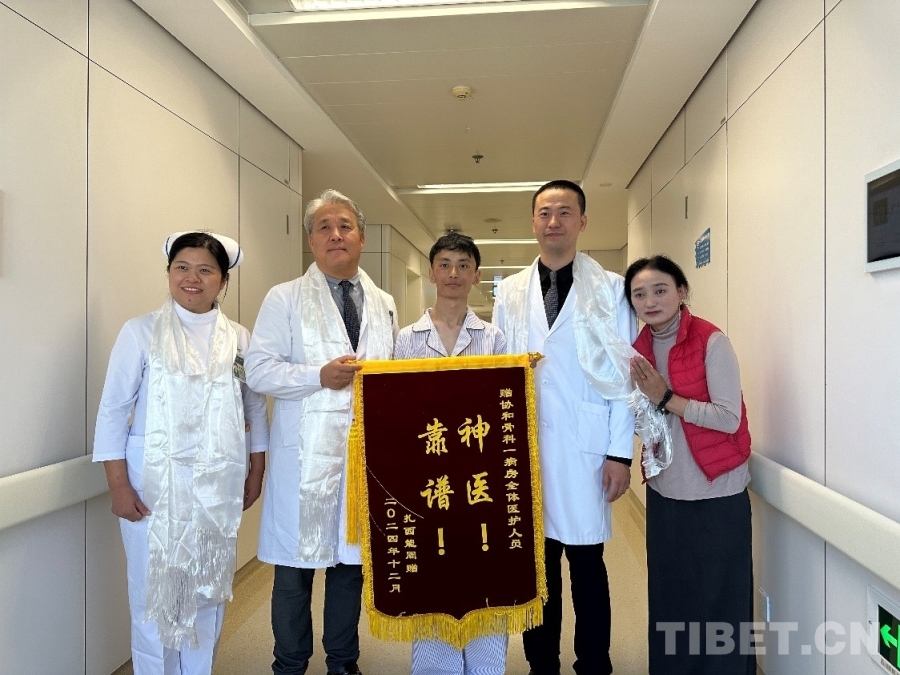 圖為扎西和母親向協(xié)和醫(yī)院骨科醫(yī)療團(tuán)隊贈送錦旗 攝影:楊眉笑