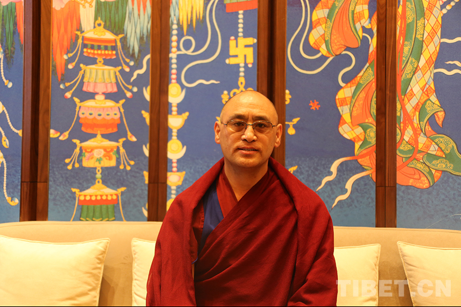圖為藏傳佛教第十六屆“拓然巴”高級學銜獲得者、旺達寺民管會主任澤翁巴登接受記者采訪 攝影:龍真多吉