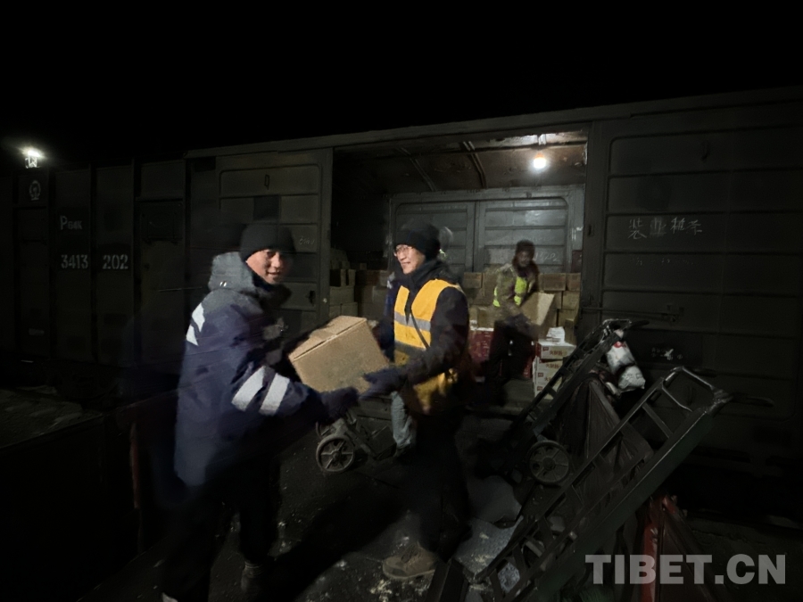 圖為首趟抗震救災(zāi)物資專列抵達日喀則,工作人員爭分奪秒進行物資搶卸轉(zhuǎn)運 攝影:周悅翔 馬生明