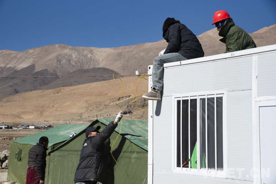 圖為工作人員正在受災(zāi)僧尼安置點活動板房外安裝照明設(shè)備 攝影:趙振宇