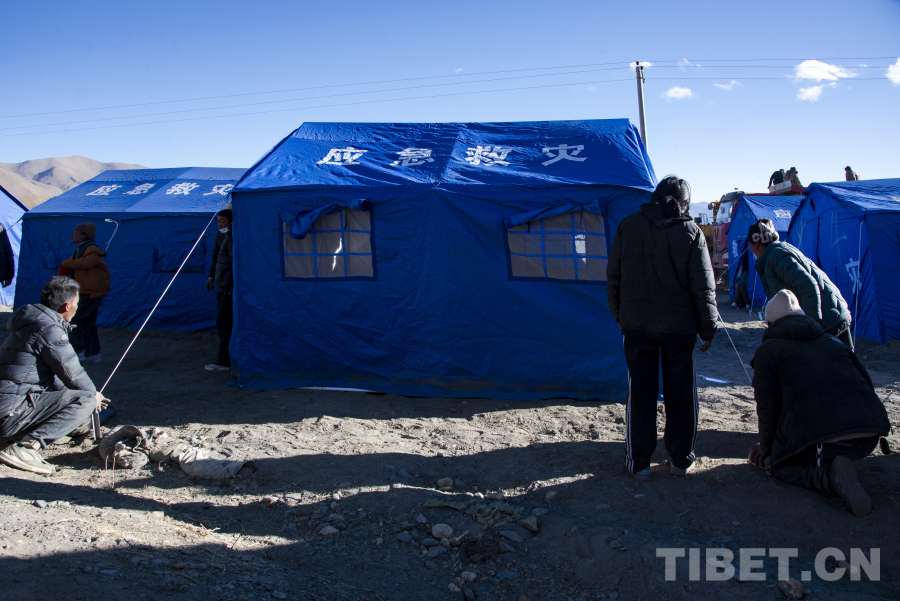 圖為嘎旦村受災(zāi)村民正在相互幫助搭建安置帳篷(攝于1月8日) 攝影:趙振宇