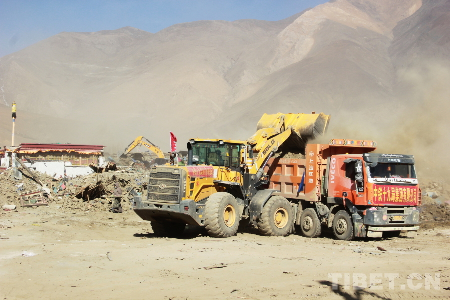 圖為地震重災(zāi)區(qū)西藏自治區(qū)日喀則市定日縣長所鄉(xiāng)森嘎村危房除險現(xiàn)場,裝載機正在向渣土車傾倒建筑垃圾 攝影:劉莉