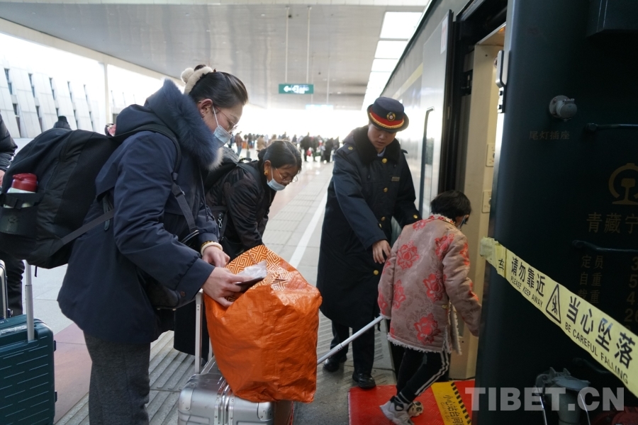不一會,等待檢票上車的人排起了長隊,他們是來拉薩朝圣結(jié)束準(zhǔn)備回家的藏族老人,他們是結(jié)束了一年工作回鄉(xiāng)過年的外地務(wù)工人員,他們是來拉薩探親的母子,他們是去成都與家人團聚的母女三人……短短15節(jié)車廂,囊括了中華民族各族群眾在春節(jié)來臨時短暫相聚于火車上的世間百態(tài):大包小包的行李、火車上準(zhǔn)備的食物、手中的轉(zhuǎn)經(jīng)筒、和媽媽撒嬌的孩子、手機上跳動的畫面……