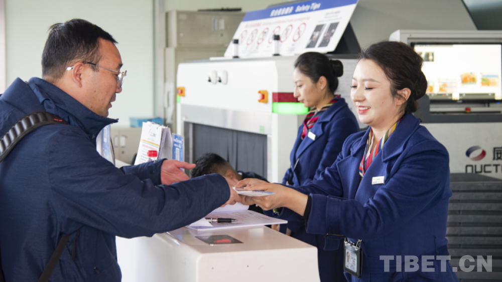 “您好,先生,請問您乘坐藏航哪趟航班?請出示您的身份證。您有托運行李嗎?托運行李中有鋰電池、充電寶嗎?這些是不能托運的,只能隨身攜帶。請拿好您的登機(jī)牌。再見,祝您歸途愉快!”1月25日,記者在拉薩貢嘎國際機(jī)場T3航站樓G島柜臺,見到了西藏航空公司拉薩基地值機(jī)服務(wù)隊隊長次仁卓嘎。