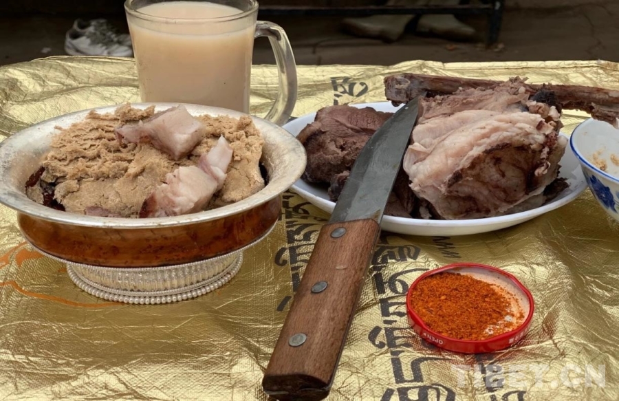 到了中午,我們會邀請鄰里親戚來家里做客,除了準備米飯蔬菜,在牧區(qū),主人家還會煮牛羊的頭來招待客人。大人們都愛吃肉,年輕人都喜歡吃各類蔬菜。到了下午,我們就會吃人參果拌酥油,還有肉包子。
