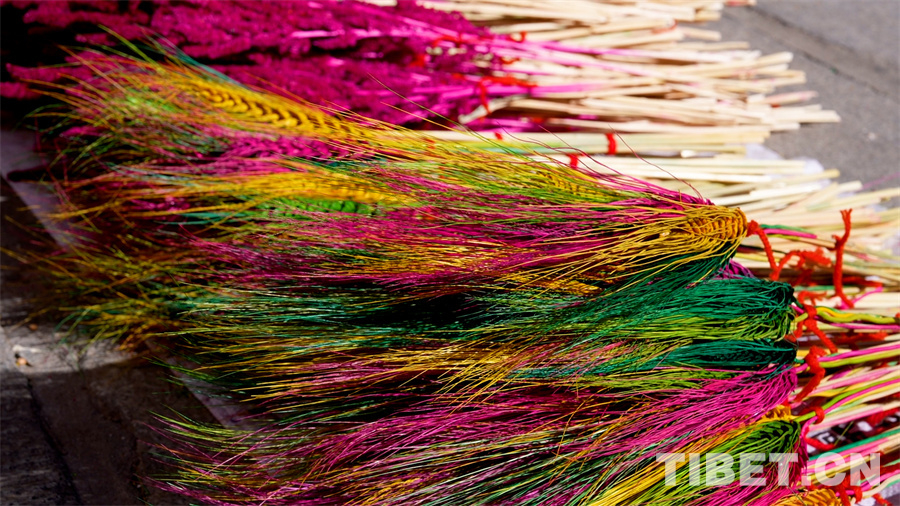 在藏歷新年年貨物品中,提及酥油花就不得不提它的“搭檔”“羅薩梅朵”,正是因?yàn)樗鼈兊难b點(diǎn)讓藏歷新年中本身就已很精致的“切瑪盒”更加亮眼。“羅薩梅朵”被稱為“冬季里最美麗的花”,是經(jīng)過(guò)染色的麥穗和青稞穗制作成的“花卉”。在藏歷新年或節(jié)日之時(shí),人們將其插在盛滿糌粑和青稞的“切瑪盒”上,寓意新的一年美滿、豐收。