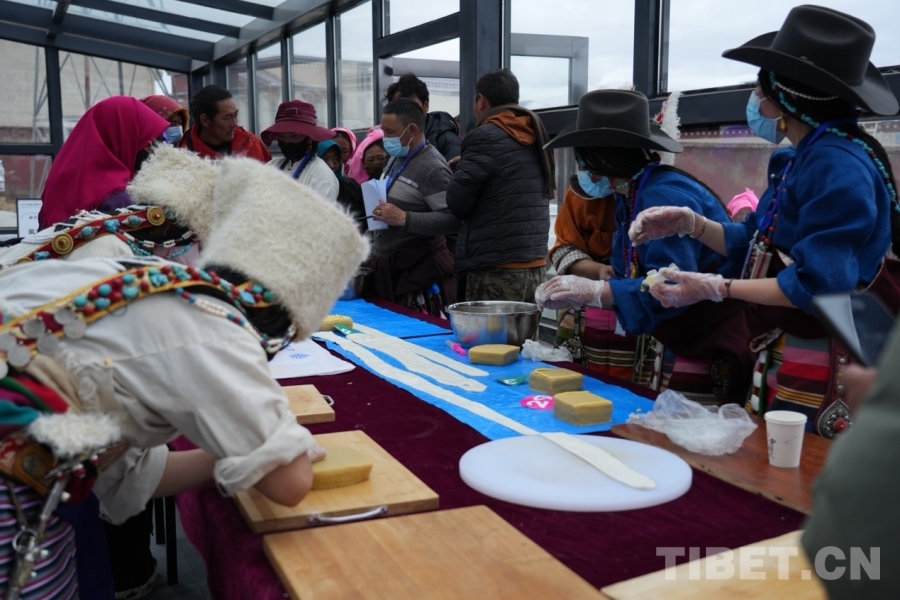 圖為“拉拉”和“推”制作現(xiàn)場?!袄焙汀巴啤笔遣乇豹?dú)具特色的一種高品質(zhì)乳制品,它可以給牧民提供極高的營養(yǎng),是招待客人和饋贈(zèng)親朋好友的食物之一。