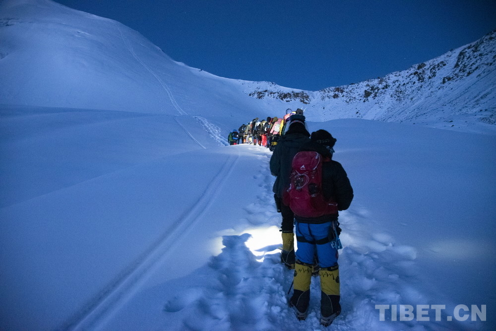 圖為5月3日,登山愛好者在凌晨出發(fā),向海拔6010米的洛堆峰峰頂進發(fā) 攝影:趙振宇