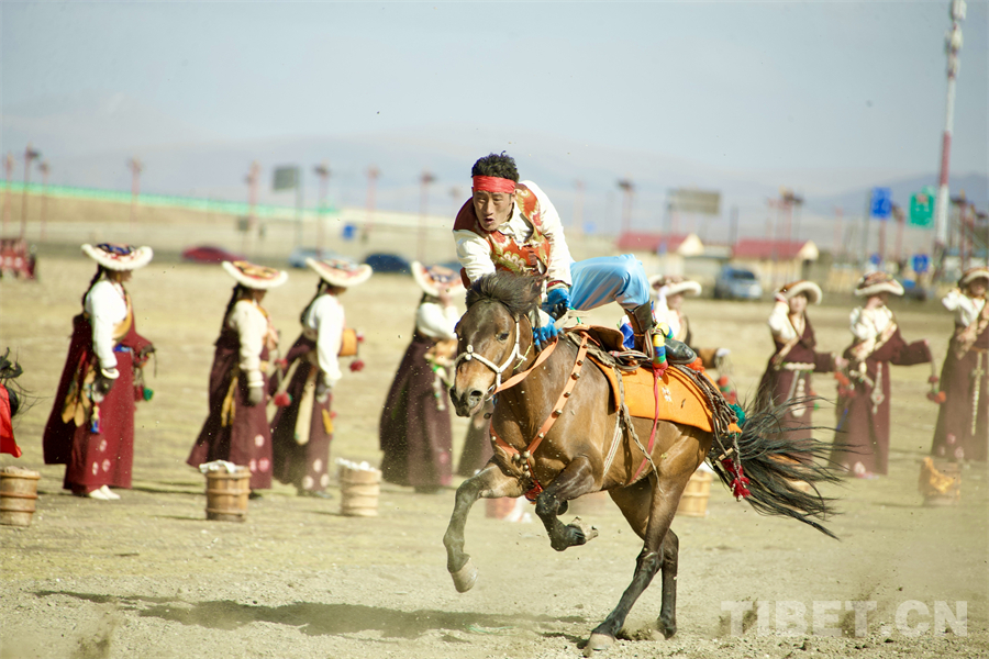 在海拔4000米左右的遼闊天地間,康巴漢子們駕馭著矯健的駿馬、身著華美的傳統(tǒng)服飾,如疾風(fēng)般掠過(guò)金色的草原,在馬背上展示跑馬射箭、乘馬射擊、跑馬拾哈達(dá)、跑馬倒立、跑馬懸體等高難度動(dòng)作,馬蹄聲聲、歡呼陣陣,交織成高原最豪邁的樂(lè)章。(中國(guó)西藏網(wǎng) 記者/畢然 龍真多吉)