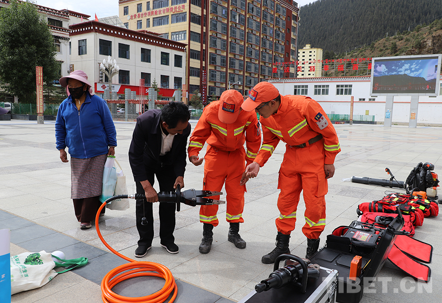 “這是我們最新配發(fā)的液壓擴(kuò)張器和液壓剪切器,主要用于打開救援通道……”在裝備展示區(qū),消防員土登旺堆正在為群眾詳細(xì)講解液壓剪切器、液壓頂撐器、生命探測儀等各類救援裝備的特點(diǎn)和使用方法,并邀請群眾進(jìn)行親身體驗(yàn)。