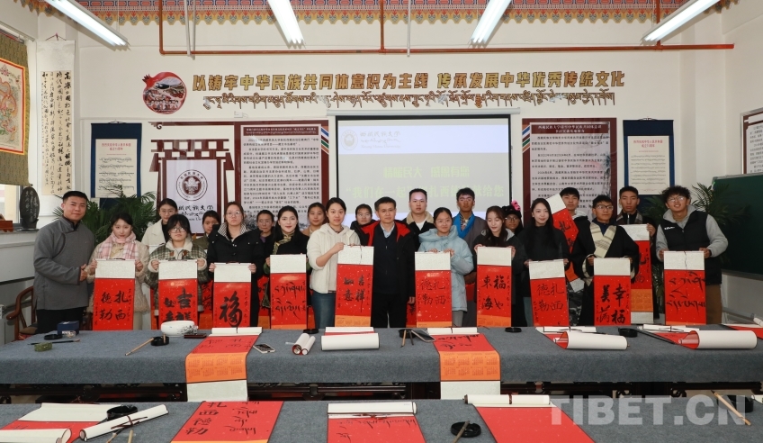 走進(jìn)西藏民族大學(xué)社科樓里內(nèi)的“鑄牢中華民族共同體意識書法實踐基地”,基地負(fù)責(zé)人扎西曲杰正帶領(lǐng)他的小伙伴書寫書法作品。指著一幅幅書法作品,扎西曲杰自豪地說,我們基地的各族學(xué)生用“寫”在一起的形式傳承中華優(yōu)秀傳統(tǒng)文化,推廣國家通用語言文字,助力中華民族共同體建設(shè)。