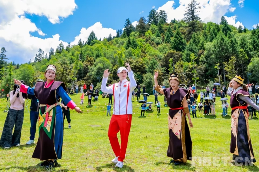 圖為奧運(yùn)冠軍走進(jìn)魯朗鎮(zhèn)高山牧場,被牧場風(fēng)光深深吸引