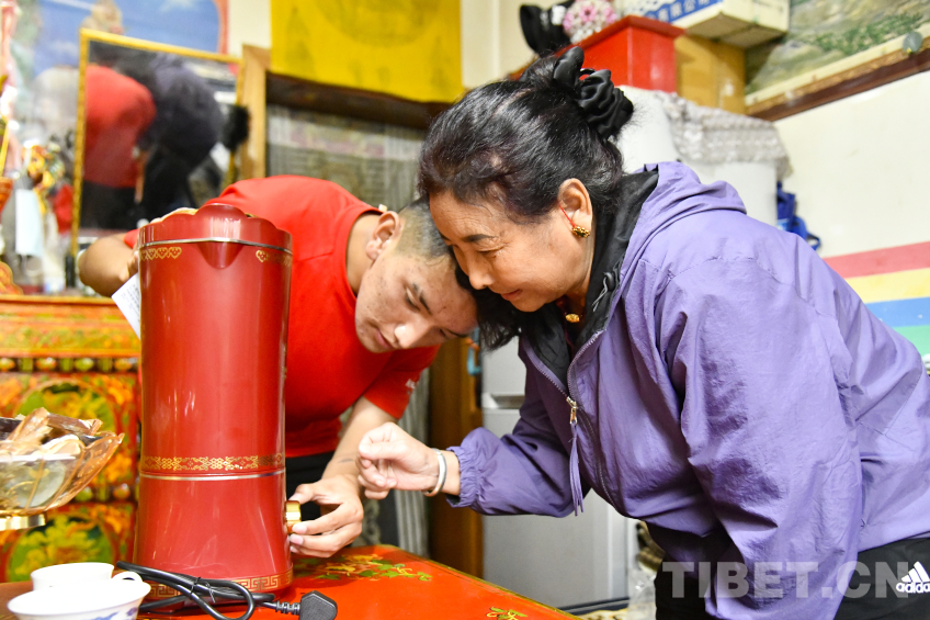 圖為卓嘎與兒子羅布次仁一起仔細(xì)研究這一臺(tái)全自動(dòng)酥油茶壺的使用 攝影:趙振宇