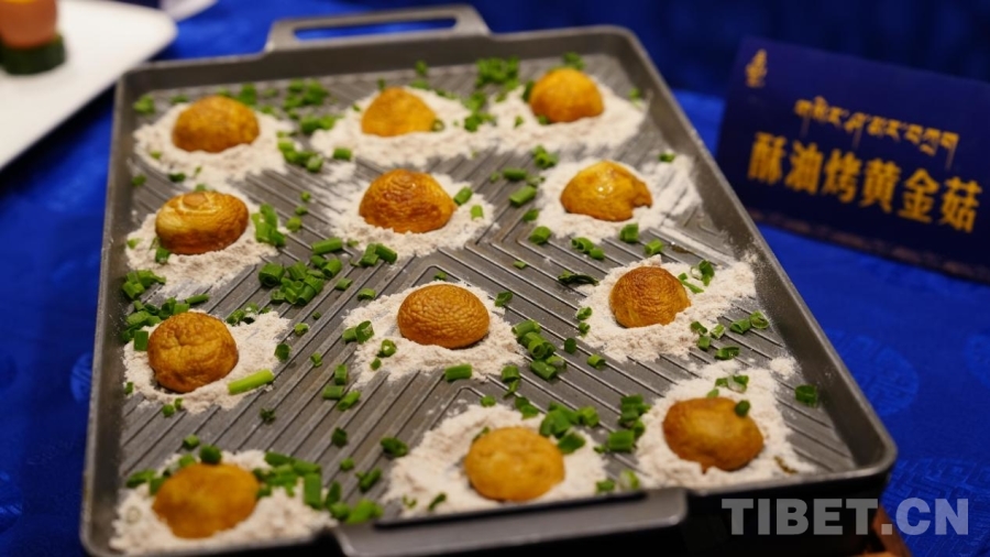 圖為廚房內(nèi)展示的“酥油烤黃金菇”菜品