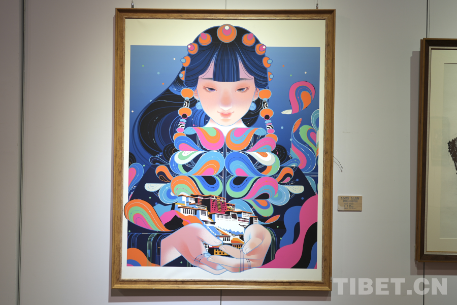 展覽現(xiàn)場,參展藝術(shù)家李旻的作品《虹光圣城》色彩絢麗,構(gòu)思新穎,引得眾多觀眾駐足觀看。據(jù)介紹,本幅作品是一副綜合運用了現(xiàn)代藝術(shù)創(chuàng)作手段的數(shù)字繪畫,同時融入了如布達(dá)拉宮、藏裝等經(jīng)典的藏式元素,畫面生動,色彩鮮艷,形式新穎,展現(xiàn)了當(dāng)代西藏藝術(shù)的傳承與創(chuàng)新,是本次展覽極具代表性的作品之一。