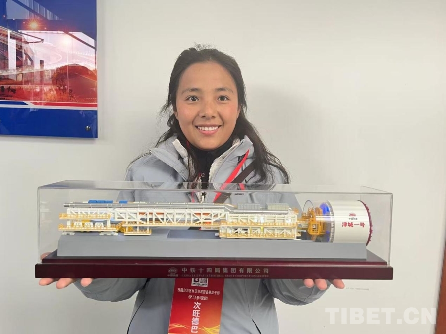 圖為西藏基層干部學(xué)習(xí)參觀團(tuán)領(lǐng)隊次旺德巴展示“津城一號”盾構(gòu)機(jī)模型 攝影:王茜