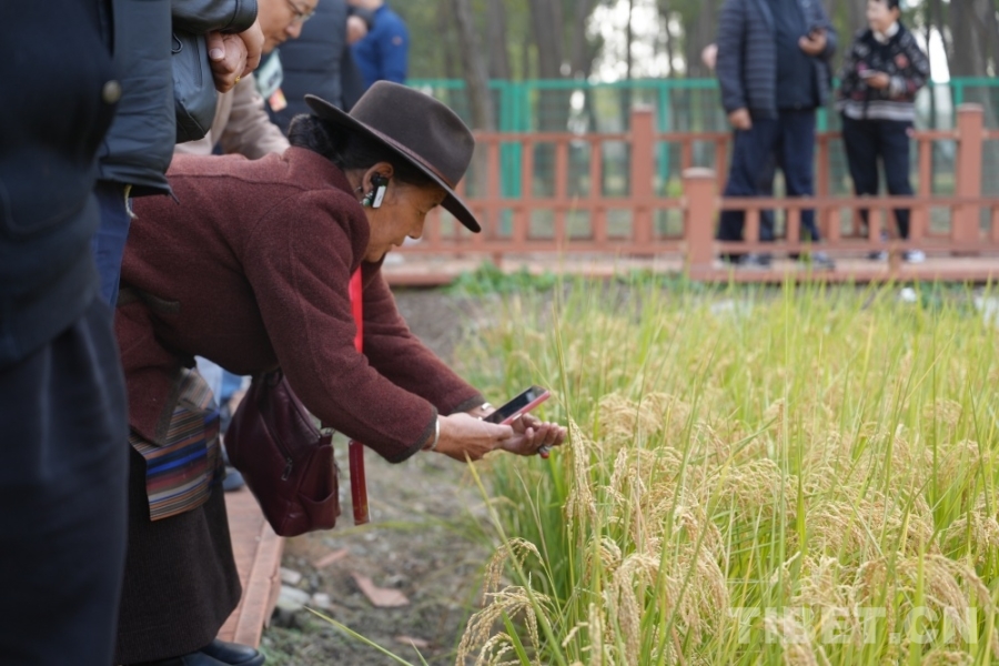 圖為西藏基層干部學(xué)習(xí)參觀團(tuán)成員對豐收的稻谷愛不釋手,連連拍攝 攝影:王茜