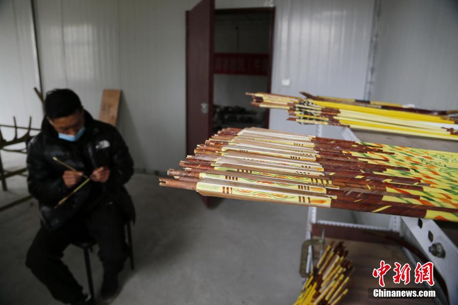 4月22日,青海省尖扎縣傳統(tǒng)牛角弓制作技藝代表性傳承人奧松多杰的一位徒弟用毛筆在箭上繪制具有藏族特色的圖案。當(dāng)日,在青海省尖扎縣,奧松多杰和徒弟們經(jīng)過(guò)切割,打磨水牛角和竹片、貼筋、繪圖等技藝,純手工制作出藏式傳統(tǒng)牛角弓。中新社記者 馬銘言 攝