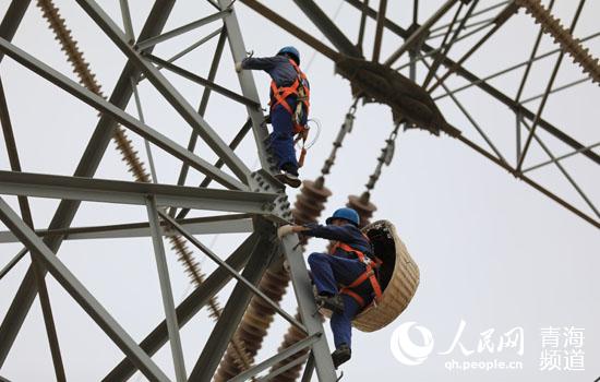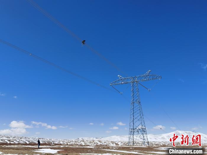 圖為5月13日,國網(wǎng)青海檢修公司輸電運(yùn)檢人員在海拔五千米的風(fēng)火山地區(qū)對(duì)“電力天路”±400千伏柴拉直流線路進(jìn)行空中走線巡檢,查找并消除線路缺陷。謝莉蓉 攝