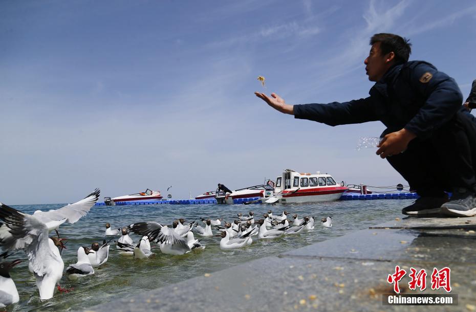 5月19日,一位游客在青海湖二郎劍景區(qū)內給水鳥喂食。當日是中國旅游日,游客在青海省海南藏族自治州青海湖二郎劍景區(qū)內乘船觀湖、與水鳥互動、感受初夏青海湖的海天一色之美。中新社記者 馬銘言 攝