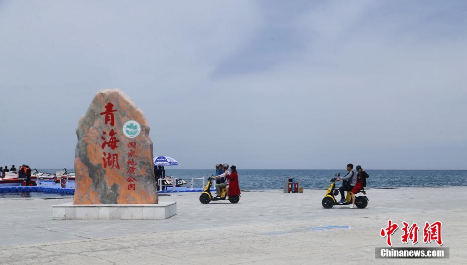5月19日,游客騎著電動車在青海湖二郎劍景區(qū)內游玩。當日是中國旅游日,游客在青海省海南藏族自治州青海湖二郎劍景區(qū)內觀湖、與水鳥互動、感受初夏青海湖的海天一色之美。中新社記者 馬銘言 攝