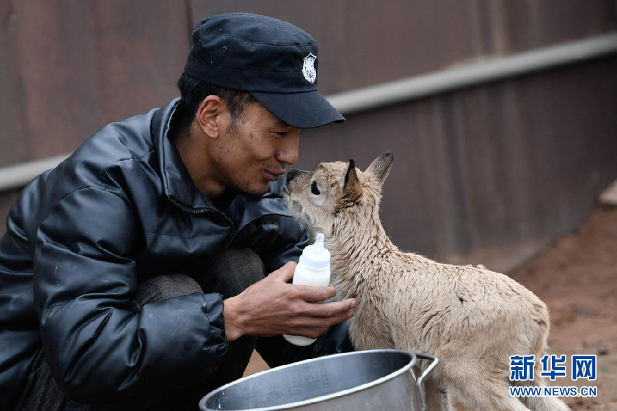 7月8日,三江源國家公園管理局長江源園區(qū)可可西里管理處卓乃湖保護站的工作人員才文多杰在給藏羚羊幼仔喂奶。新華社記者 張龍 攝